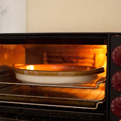 小型オーブンにも収まるサイズです。調理後そのまま食卓へ。
