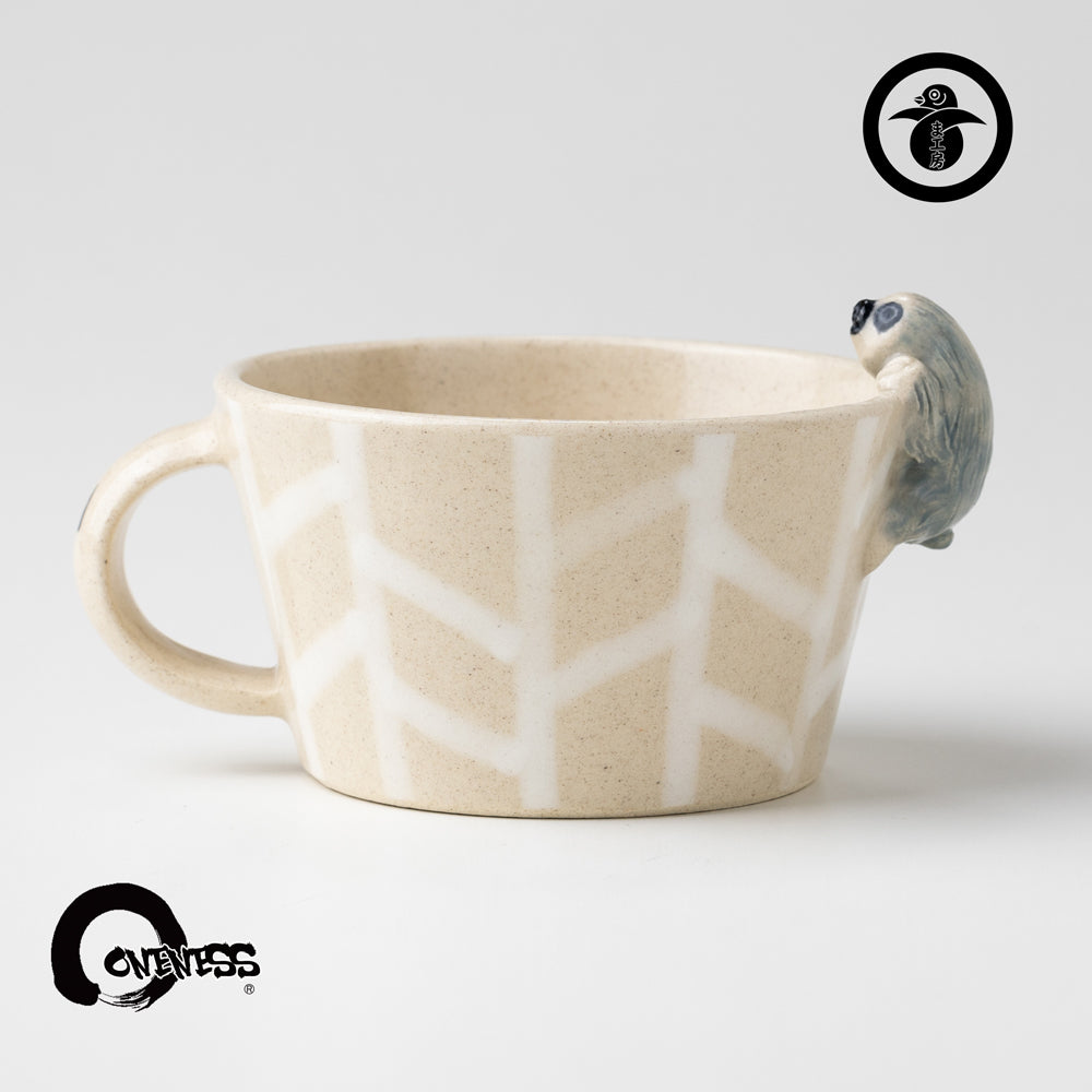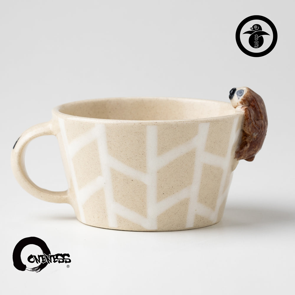 ま工房のなまけものスープカップは、陶芸作家・牧田亮さんによる手作りの温もりを感じられる日本製のマグカップです。カップの縁にぶら下がる立体のなまけものモチーフが特徴で、見るたびに癒されるユニークなデザインに仕上がっています。